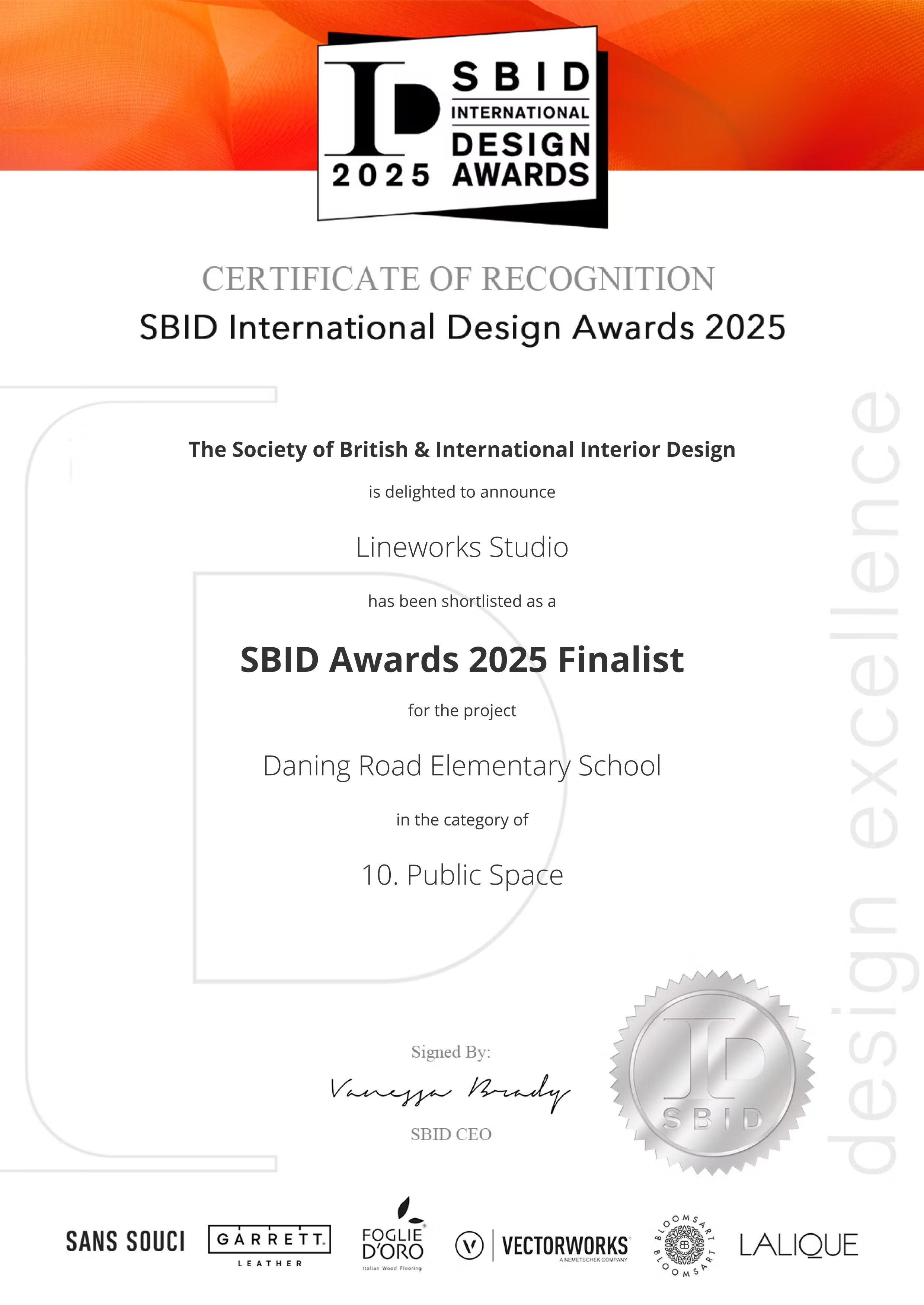 With immense delight, we are pleased to announce a new milestone for LINEWORKS Team: For the fifth consecutive year, our projects have been shortlisted for the SBID International Design Awards (UK). This year, our latest creation, Daning Road Primary School, has through the seamless fusion of innovative design philosophy and humanistic care, risen above a myriad of exceptional entries to secure its place on the finallist of the 2025 Asian Public Space Category.