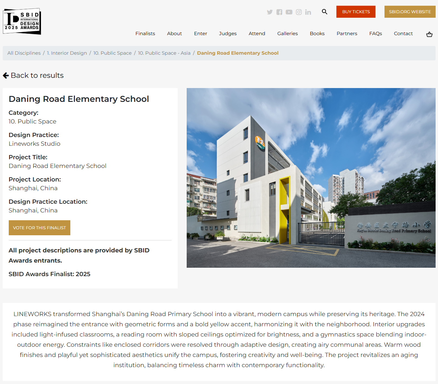 谨以喜悦之心向您宣告:LINEWORKS团队再传捷报!团队的作品连续5年入围英国SBID国际设计大奖。我们的新作–大宁路小学,凭借创新设计理念与人文关怀的深度融合,从众多优秀作品中脱颖而出,强势入围2025年度亚洲公共空间类别决赛名单。